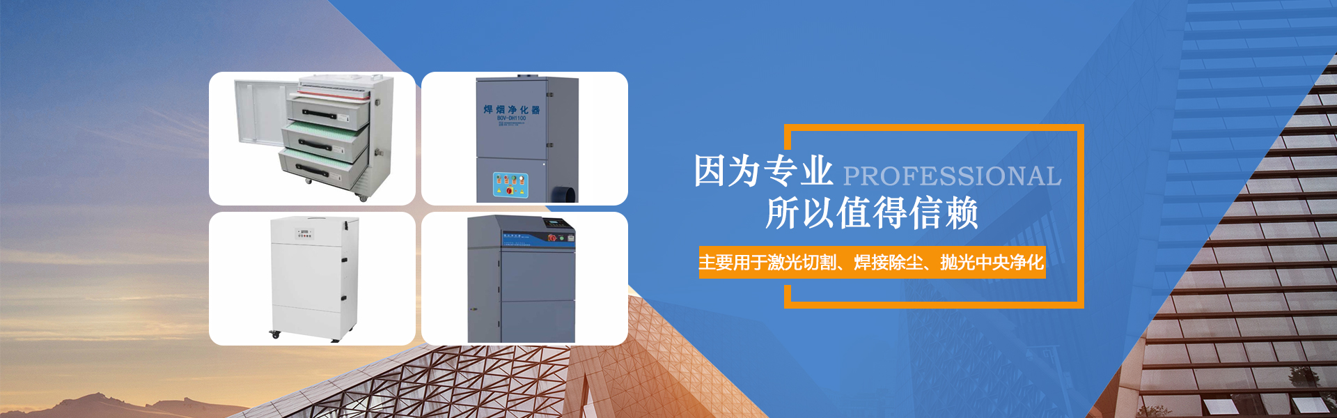 环保除尘产品应用到机械制造、激光加工、PCB、化工、汽车、造船、铁路机车等100多个行业领域。是车间粉尘环境综合解决方案的最佳供应商之一,是宏山激光,大族激光,迅镭激光,百超迪能激光,百盛激光,武汉天琪激光等国内知名激光厂商的指定配套合作伙伴。